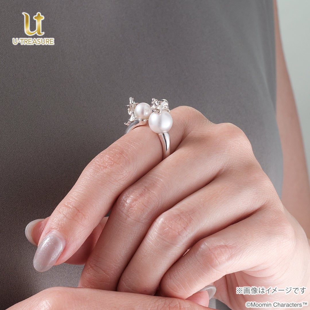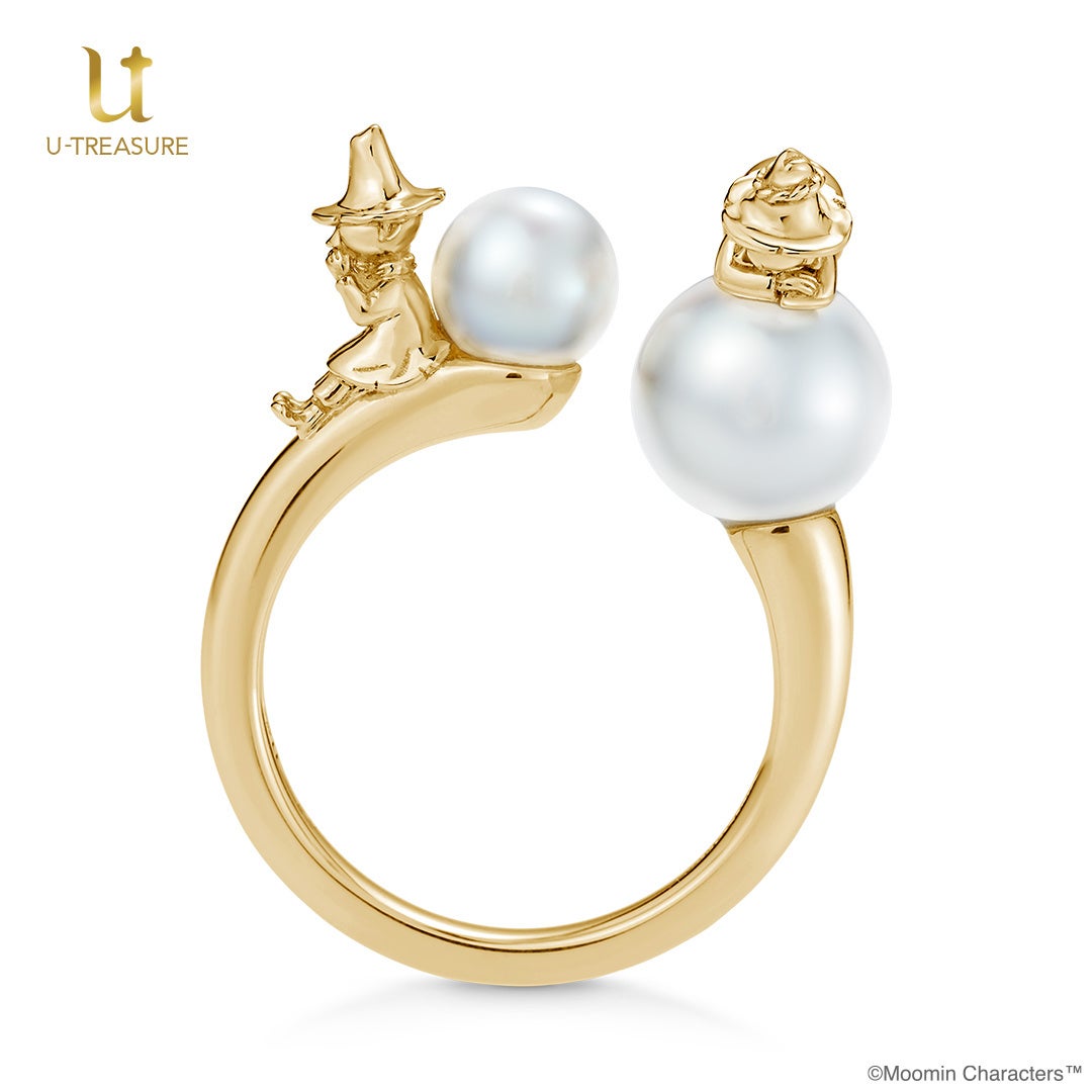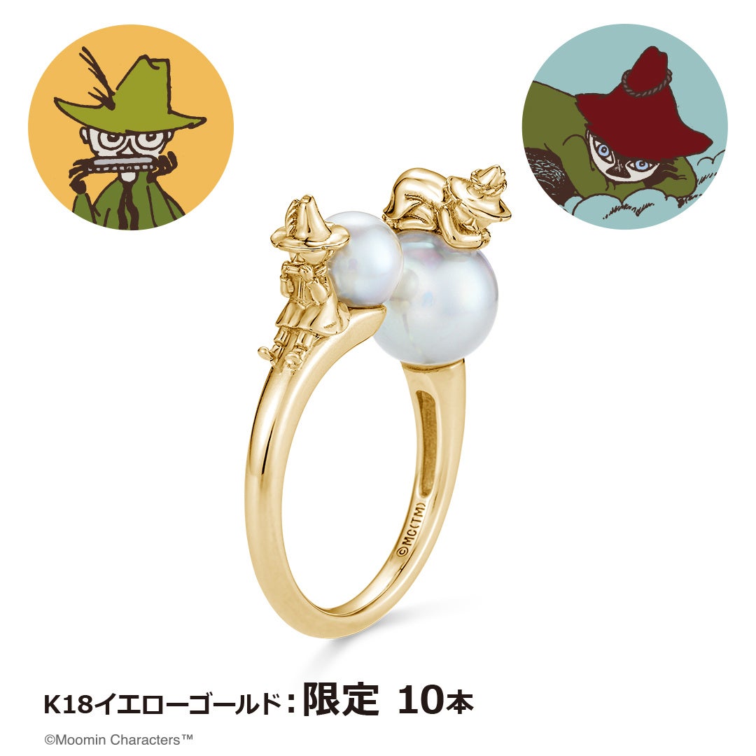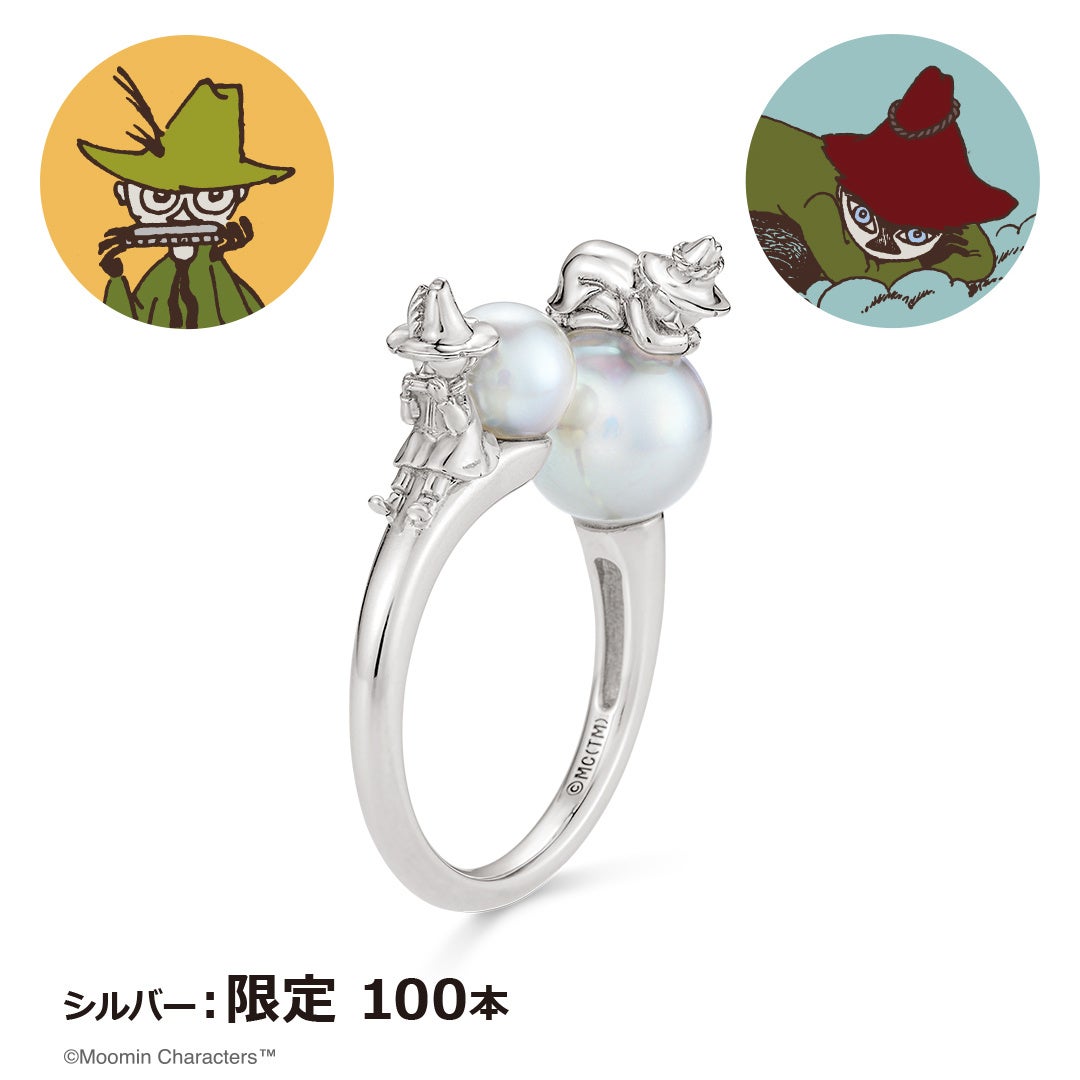 このたびの新作は、スナフキンとお父さんであるヨクサルの『父と子』というつながりを表現したフォークリング(指輪)です。向かい合うようにセッティングした、サイズの異なる2珠の天然のパール(淡水)が手元を華やかに彩ってくれます。自然が育んだパールは、一つひとつ異なる表情が魅力のひとつです。パールの上にちょこんと乗ったヨクサルとスナフキンは職人が細部まで立体的に表現しました。シルバーは100本、K18イエローゴールドは10本の数量限定です。