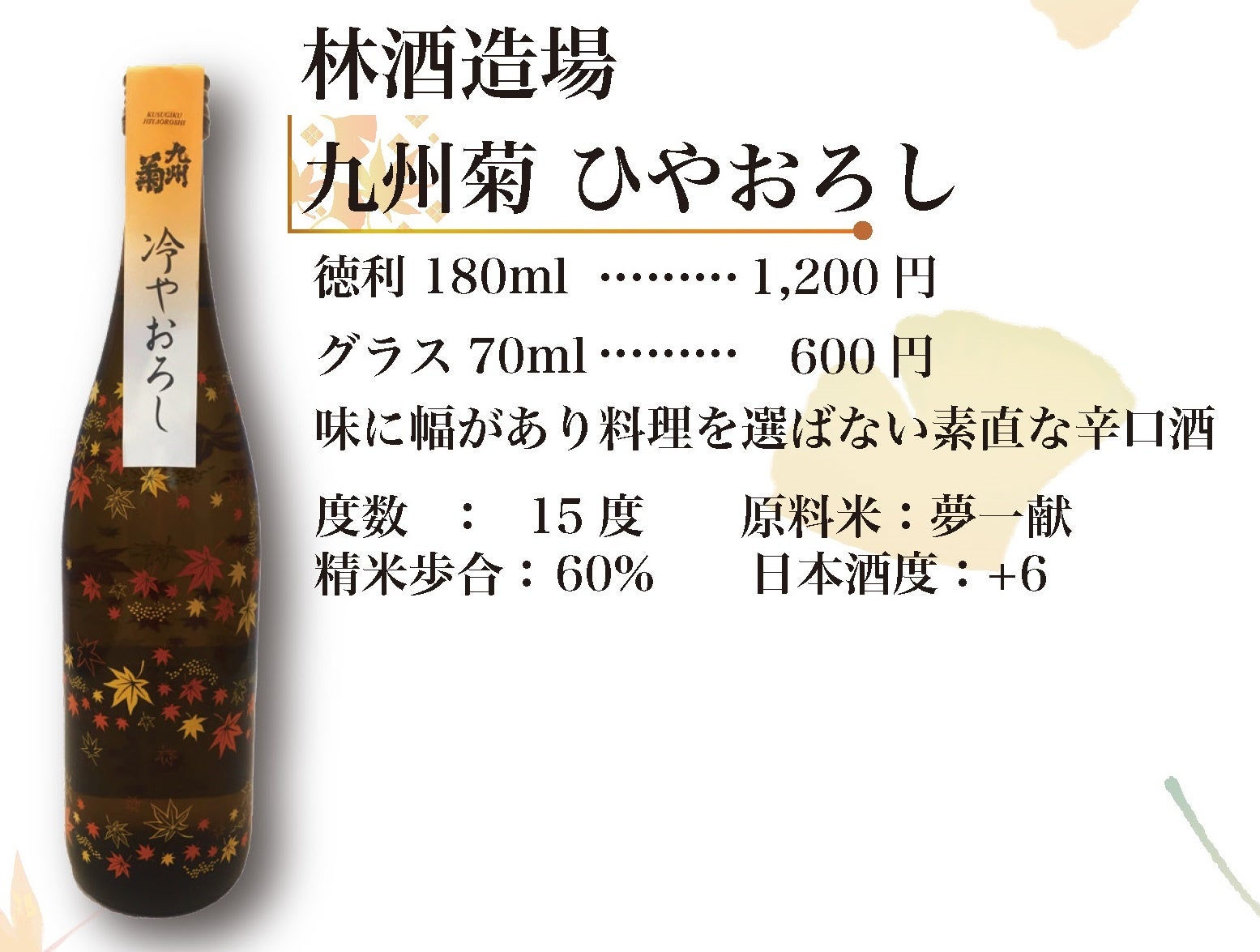 JR九州ステーションホテル小倉(福岡県北九州市)では、福岡県産日本酒「ひやおろし」フェアを期間限定で開催いたします。「ひやおろし」とは、春に仕込んだ日本酒を一度だけ火入れし、ひと夏寝かせた後に出荷される秋限定の酒です。そのまろやかで豊かな味わいは、秋の味覚との相性も抜群です。