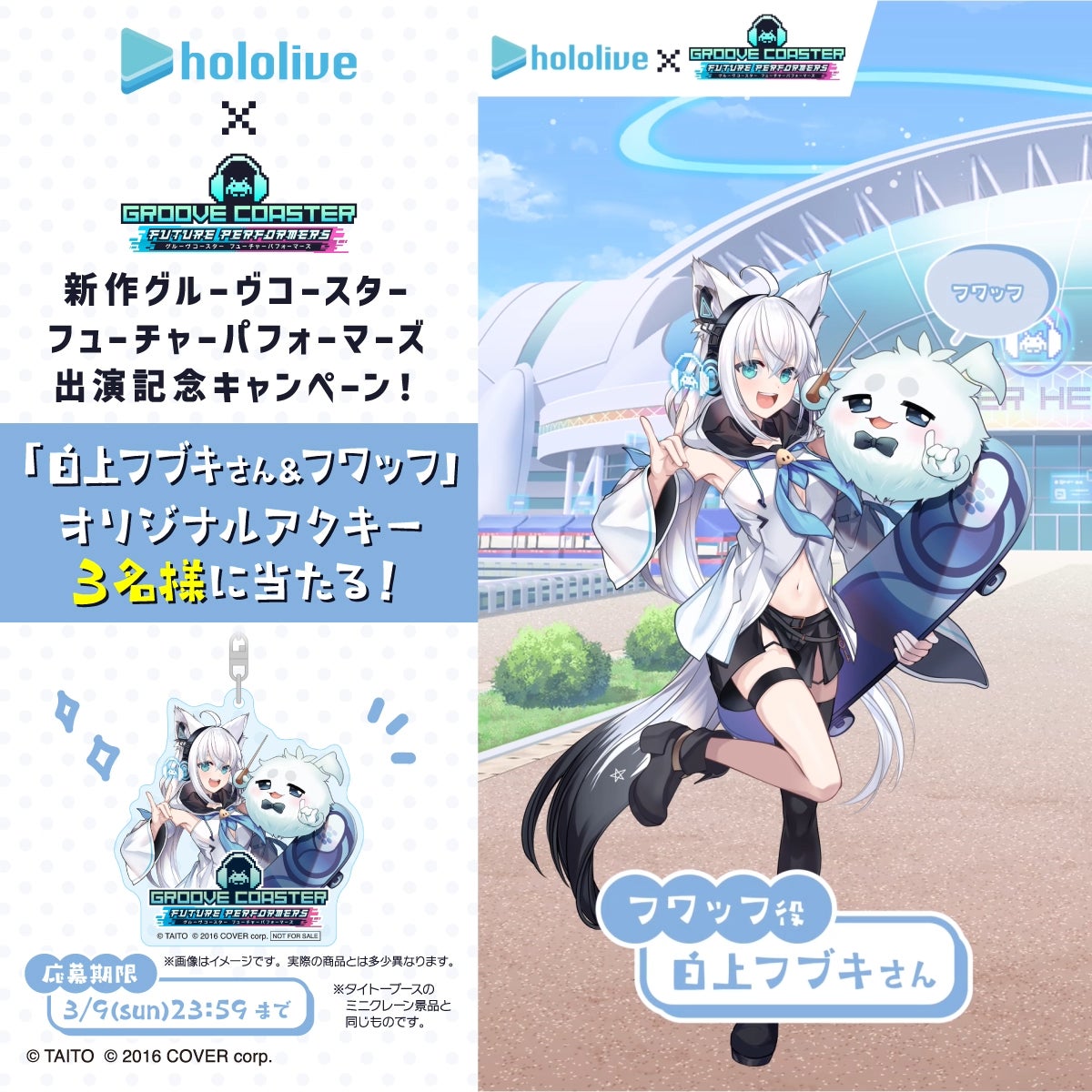 グルーヴコースター公式X(@groove_coaster)のフォローと《hololive SUPER EXPO 2025》のタイトーブースでの撮影写真+ハッシュタグ「#グルコスFP」を付けての投稿で、白上フブキさん、さくらみこさんの限定アクリルスタンドを2体セットで25名様にプレゼントいたします。ぜひタイトーブースに遊びにきてください。