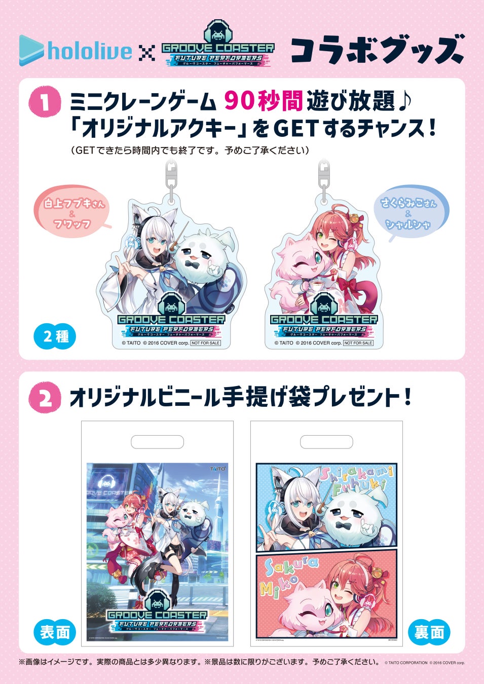※当選賞品は、《hololive SUPER EXPO 2025》のタイトーブース内ミニクレーンの景品と同じです。※当選された方にグルーヴコースター公式Xアカウントより、ダイレクトメッセージにてご連絡をいたします。※キャンペーン利用規約は、『グルーヴコースター フューチャーパフォーマーズ』公式サイトにて、ご確認ください。