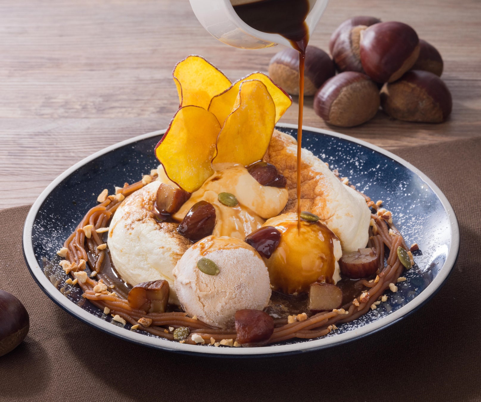 しっとり食感に冷やしたパンケーキに、モンブランクリーム、渋皮栗煮、カラメルカスタード、渋皮栗アイス、バニラアイスをトッピングしました。