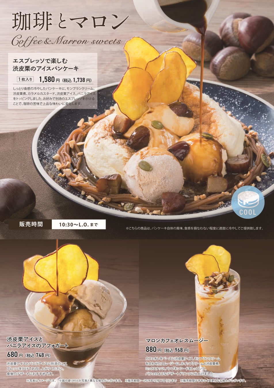 人気のパンケーキの季節限定メニュー「エスプレッソで楽しむ 渋皮栗のアイスパンケーキ」をはじめ、飲むパフェとしてお楽しみいただけるデザートドリンク「マロンカフェオレスムージー」など、秋の味覚の栗に、ほろ苦い珈琲を合わせたちょっと大人な季節限定メニューをご用意しました。
