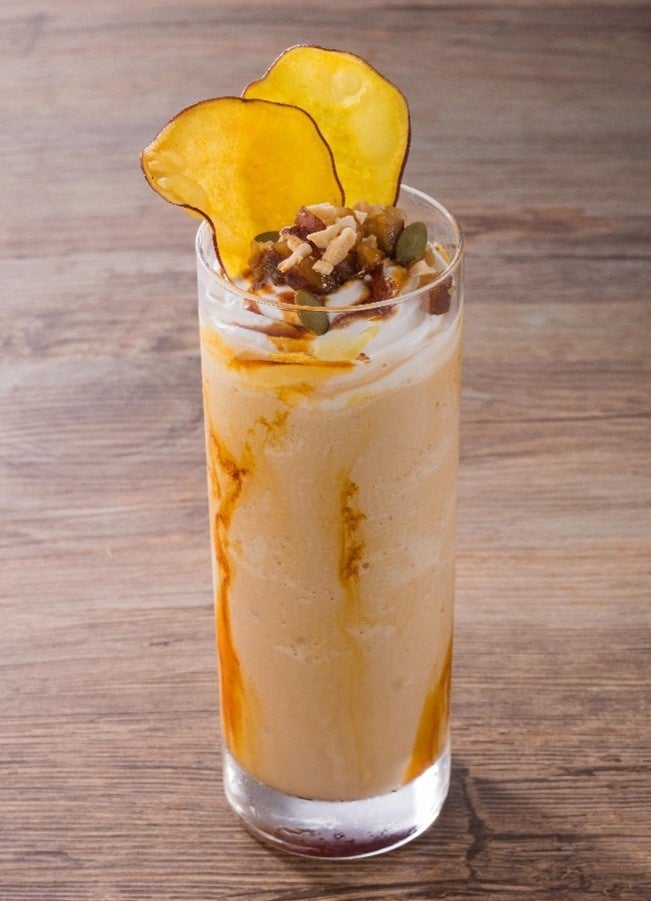 カフェオレをベースに渋皮栗アイス、モンブランクリームを合わせたスムージーに、ホイップクリームと渋皮栗煮、ミックスナッツ、パンプキンシードをトッピング。パフェのようなデザートドリンクに仕上げました。