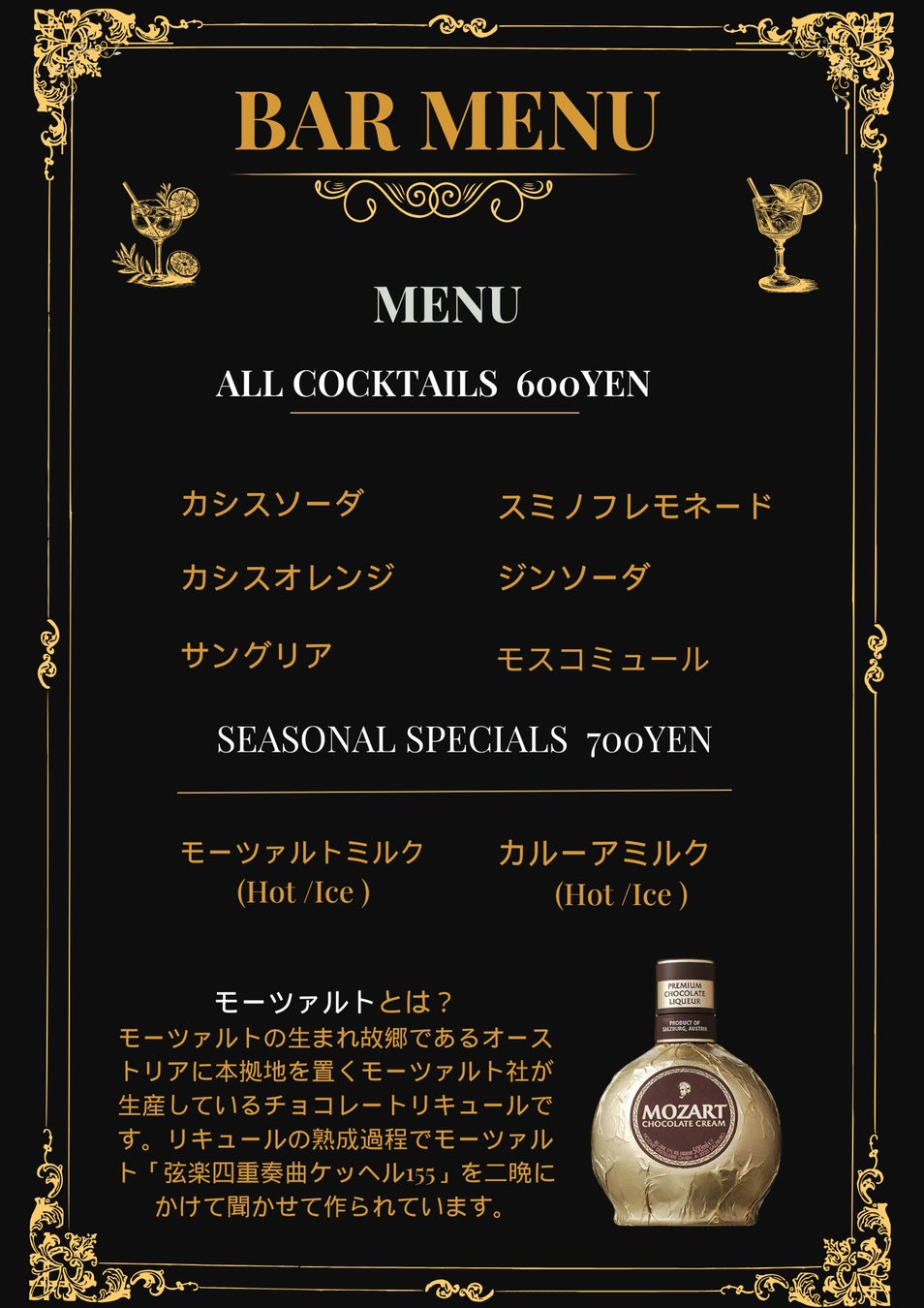 バーの営業時間は19:00~21:00です。(BARメニューに使用する食材の提供も含まれます)