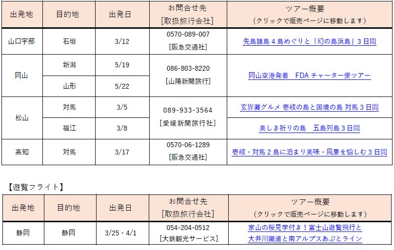上記は、現在一般販売している旅行ツアーの一部となります。全てのチャーター便・遊覧フライトの運航予定を記載しているものではありませんのでご了承ください。