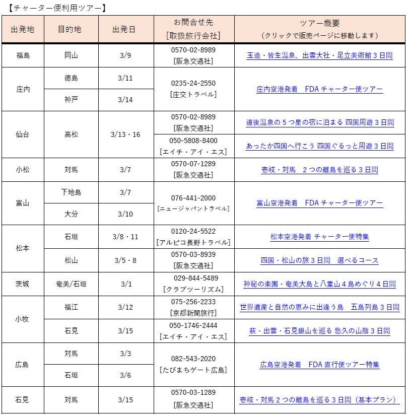 現在募集中の、FDAチャーター便を利用した旅行ツアーのご案内です。