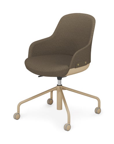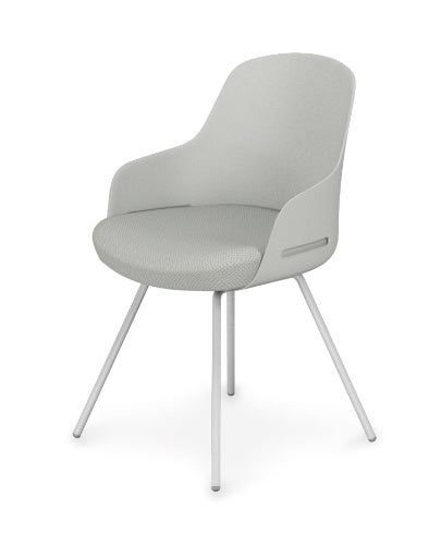 背はクッションタイプと樹脂タイプがあります。クッションタイプは、背と肘部をファブリックで包んだ、やさしい印象のデザインで、ファブリックの内側にスラブポリウレタンを採用しているので、背当たりもソフトです。樹脂タイプは、軽快ですっきりとした印象を演出します。それぞれカラーバリエーションも豊富で、脚は4本脚、キャスター脚、昇降脚、木脚の4パターンからお選びいただけます。