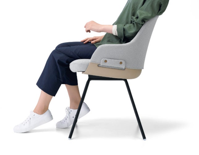 また、環境保全に配慮したサステナブル設計を取り入れていることも特長のひとつです。汚れやすい背クッションは、スナップボタンで簡単に交換可能のため、永く良い状態でお使いいただけます。さらに背部分の樹脂シェルの素材は、バイオマスプラスチックを使用しています。多様化するワークスタイルやインテリアに柔軟に対応しつつ永く愛用できる、サステナブルなカジュアルチェアーです。