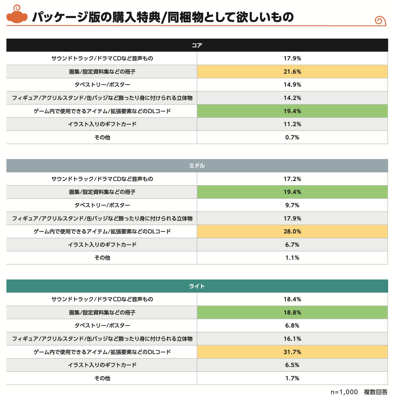・購入特典/同梱物として欲しいものはライト層/ミドル層が「ゲーム内で使用できるアイテム/拡張要素などのDLコード」、コア層は「画集/設定資料などの冊子」が最多