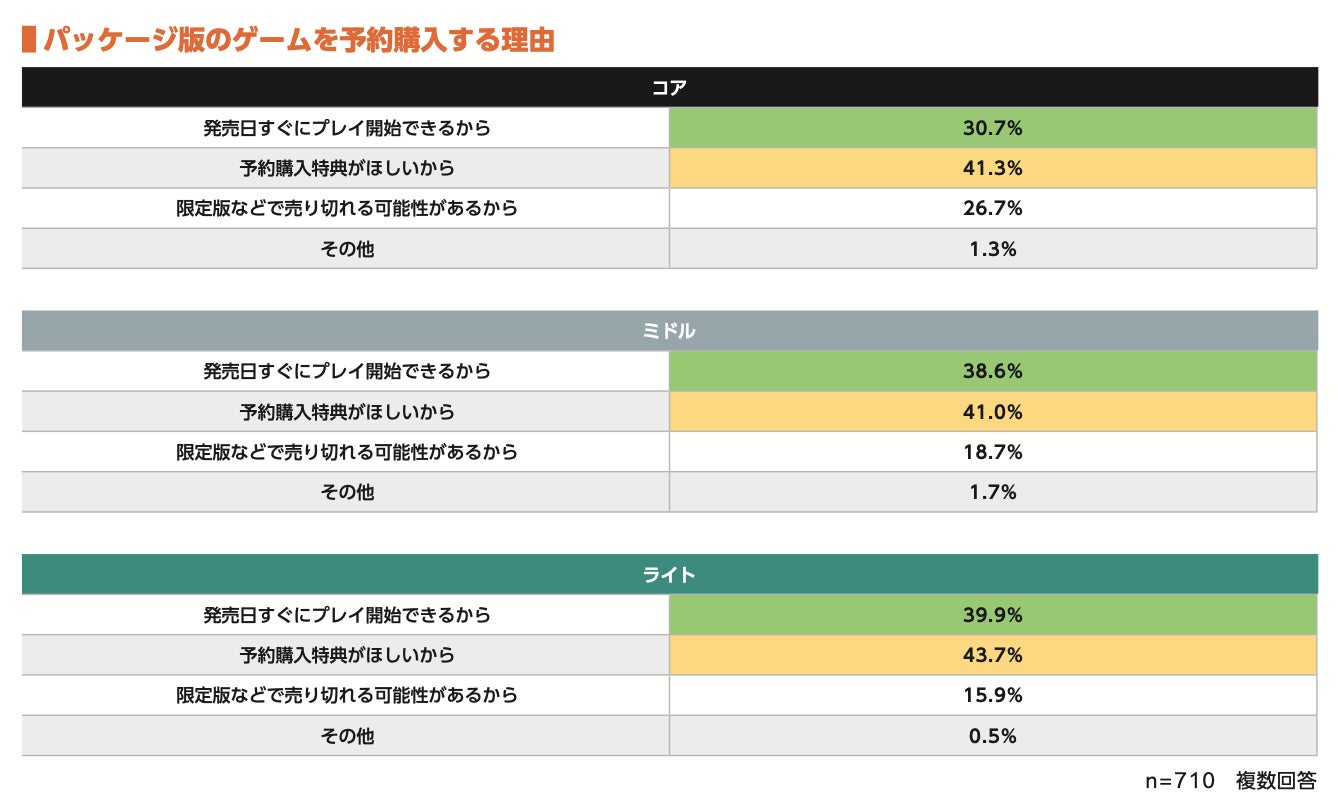 パッケージ版ゲームは家庭用ゲーム機ユーザーからの需要大。ミドル層/コア層では80%以上のユーザーが欲しいゲームの予約購入を検討