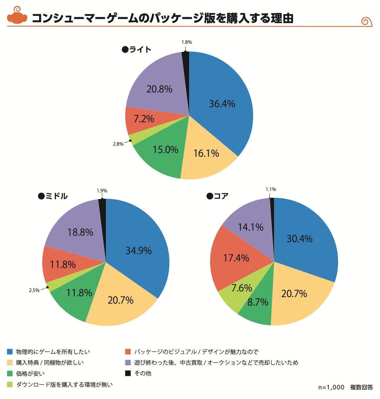一 方 、ライト層/ミドル層では売却のため、という回答が多くなっています。ゲームに使うお金が大きくない層であるため、趣味のメインはゲームではないと思われること から、コレクションするのではなく、色々なゲームを楽しむための手段としてパッケージ版の購入が選択されている、と言えそうです。