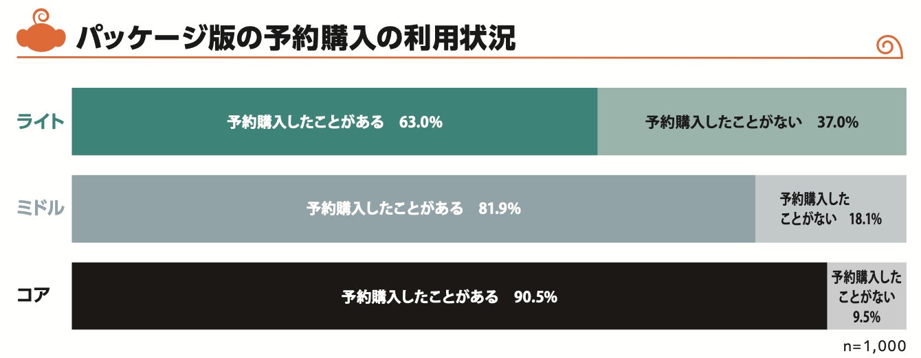 ユーザー層での割合の差はありますが、全ての層で予約購入経験があるという回答が多数を占めており、特にミドル層/コア層では、ほぼ全てのユーザーが欲しいゲームを予約して購入するという選択肢が検討されている状況が見えます。