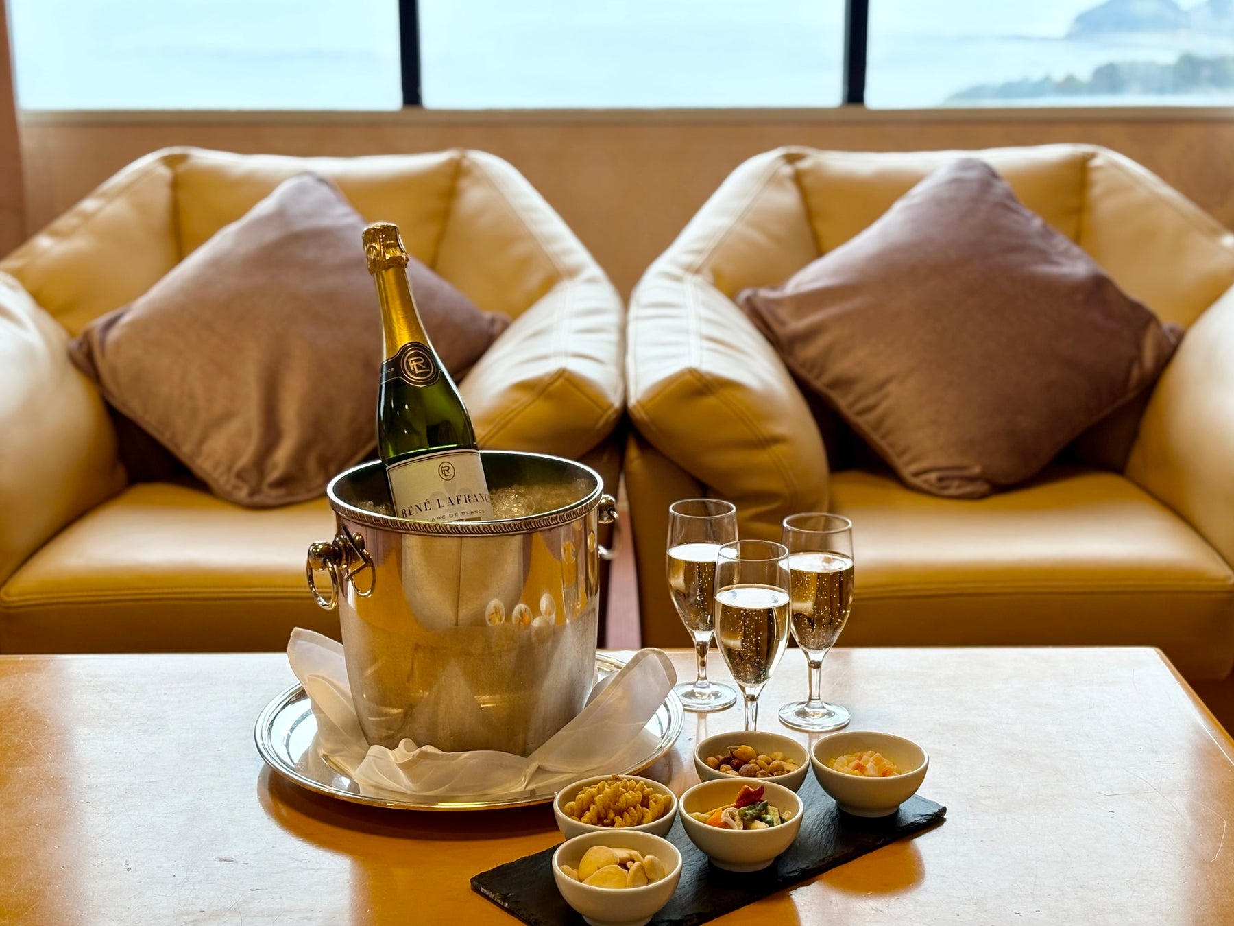 当プランでは和洋室タイプのスイートルームに宿泊いただきます。また、通常より1時間早い14時にアーリーチェックインでお部屋にご案内いたします。チェックインの混雑を避け、早々に入室いただいた客室で、スパークリングワインのウェルカムドリンクをお楽しみください。窓の外に広がる絶景を眺めながら、非日常の始まりに期待が膨らむ瞬間です。