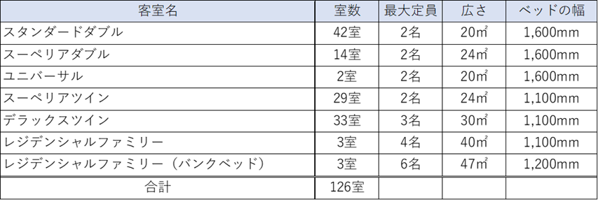 1.客室シングルルームの客室を全て見直し、2 名でご宿泊可能な1,600mm幅のダブルベッドを設置。海外のご家族連れのお客様に人気のトリプル(3 名部屋)、フォース(4 名部屋)等バリエーションに富んだ客室構成としています。