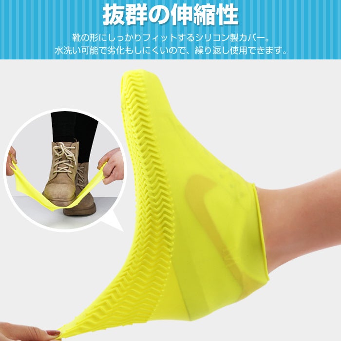伸縮性のある素材で、靴にピッタリとくっつき雨の侵入を防ぎます。