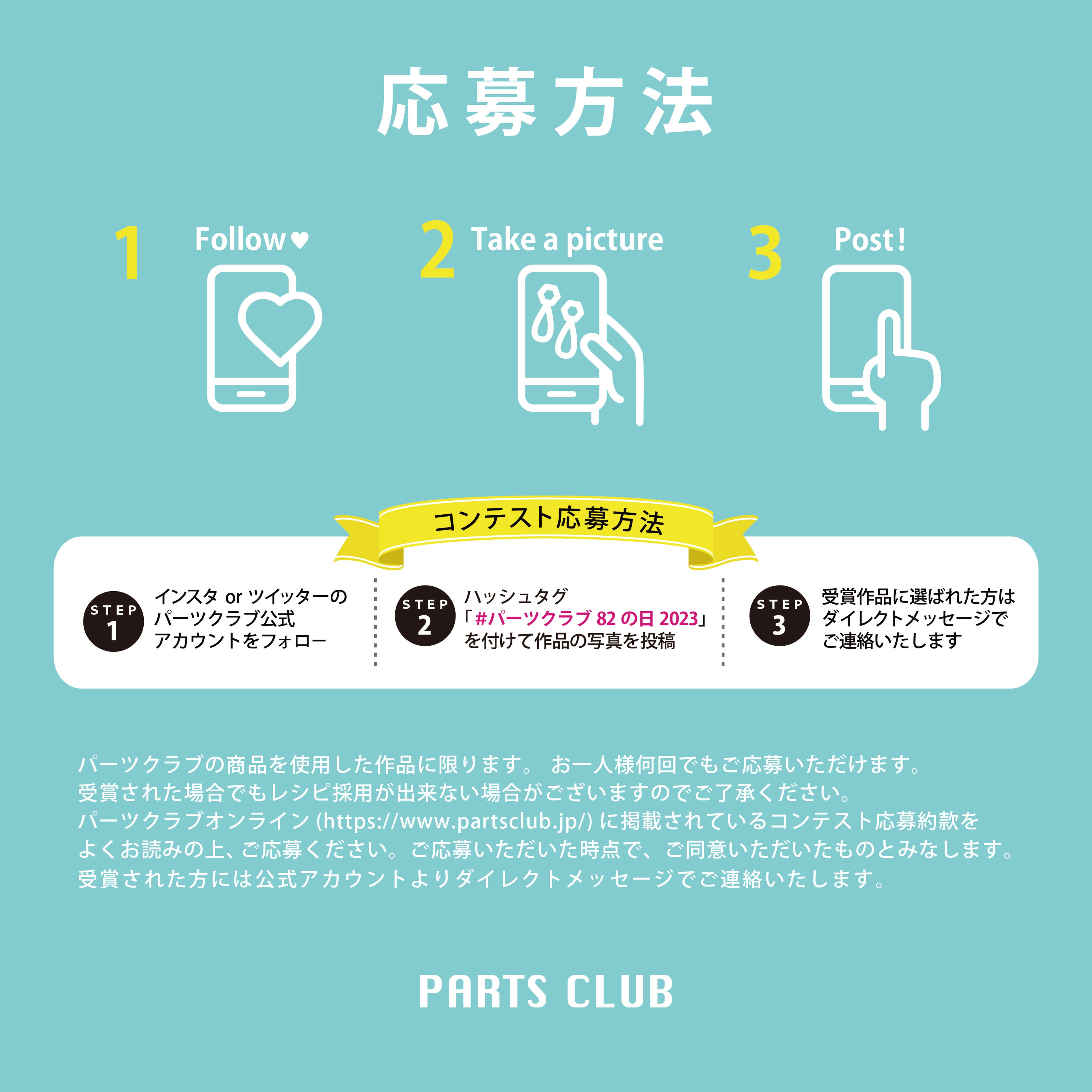 パーツクラブのパーツを使った作品を、【 #パーツクラブ82の日2023 】を付けて、InstagramまたはTwitterへ投稿するだけ!