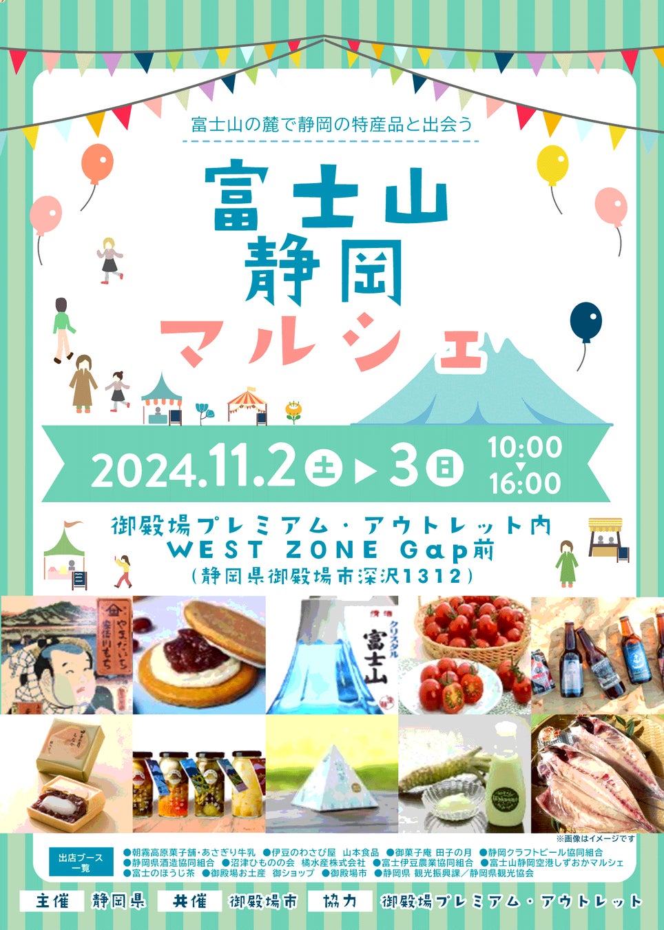 御殿場プレミアム・アウトレットにて、11月2日(土)と3日(日)の両日、県内の事業者等11者が出店する「富士山静岡マルシェ」を初開催します。