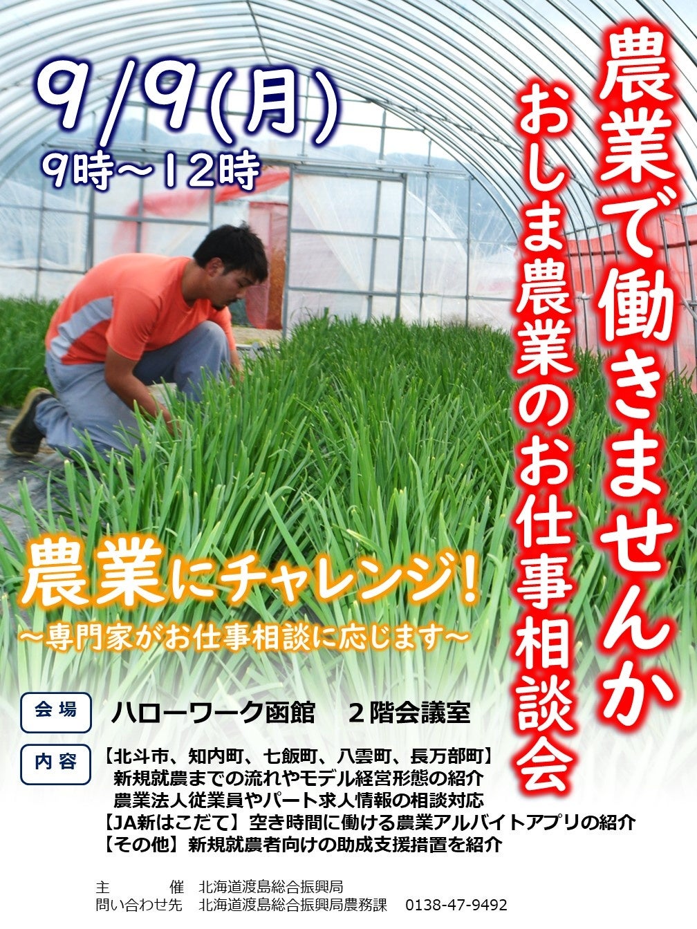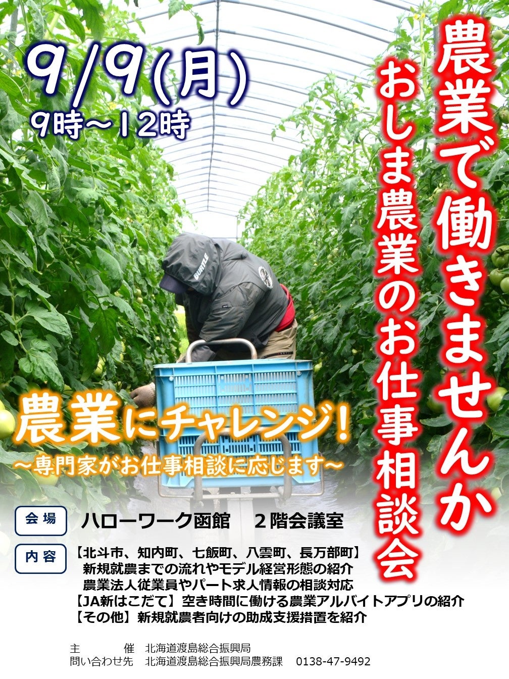 9/9(月)函館市で、新規就農を目指している方、農業で就業先を探している方、農業バイトに興味のある方、農業に興味をお持ちの方、どなたでも参加可能な「農業お仕事相談会」を開催します。