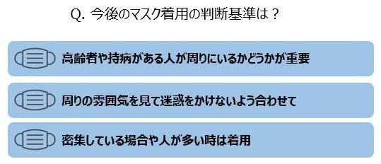 今後のマスク着用に関して、「できるだけ着用したい」、「必要なときのみ着用したい」、「感染リスクが高い場所のみ着用したい」と回答した方に対して、着用する/着用しないをどのように決めようと考えているか尋ねたところ、「高齢者や持病がある人がいるかどうか」、「周りの人に合わせる」、「密集している場合や人が多いときは着用」といった意見が多く見られました。