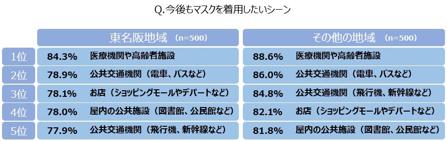 日常のさまざまなシーンにおいて今後もマスクを着用したいと思うかを東名阪地域とその他の地域に分けて尋ねたところ、マスクを着用したいシーンの1位は「医療機関や高齢者施設」(東名阪地域:84.3%、その他の地域:88.6%)で、2位は「公共交通機関(電車、バスなど)」(東名阪地域:78.9%、その他の地域:86.0%)、3位は東名阪地域では「お店(ショッピングモールやデパートなど)」78.1%、その他の地域では「公共交通機関(飛行機、新幹線など)」84.8%という結果となりました。