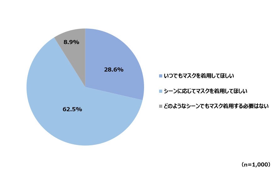 新型コロナウイルスの感染症法上の位置づけが5類に移行後、自身の周りの方にマスクを着用してほしいかどうか尋ねたところ、28.6%の方が「いつでもマスクを着用してほしい」、62.5%の方が「シーンに応じてマスクを着用してほしい」と合計91.1%の方が周りの方に「着用してほしい」と考えていることが判明しました。