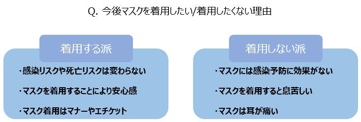 一方、マスクの着用をやめたい理由としては、「マスクの着用は感染予防に効果がない」や「邪魔だから」、「息苦しいから」、「耳が痛いから」などが挙げられました。