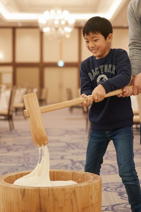 お子様が主役のお餅つき体験。小学生以下のお子様を対象に、保護者様もしくはホテルスタッフのサポートでお餅つきをご体験ください。つきたてのお餅は皆様に振る舞います。思い出に残る新年の行事となっております。