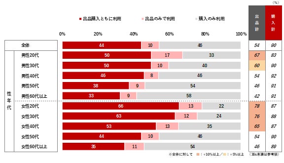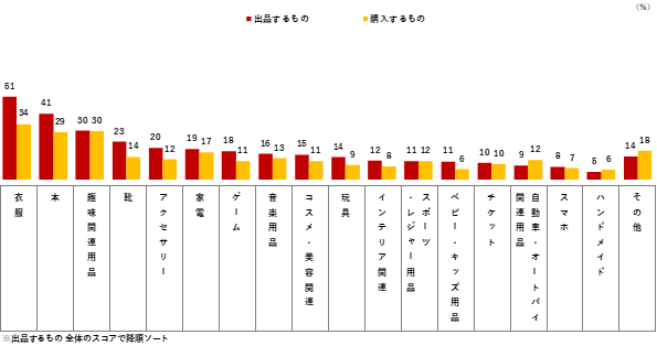 出品するものは「衣類」(51%)、「本」(41%)、「趣味関連用品」(30%)、購入するものは「衣類」(34%)、「趣味関連用品」(30%)、「本」(29%)となり、上位は同じ項目が並ぶ。一方で「スポーツ・レジャー用品」「自動車・オートバイ関連用品」は出品に対して購入の割合が高く、需要に対して供給が追いついていない可能性がある。
