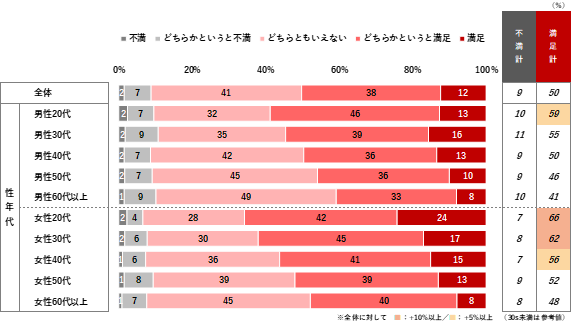 利用者における満足度は、満足(「満足」「どちらかというと満足」の合計)が50%、不満(「不満」「どちらかというと不満」の合計)が9%となり、満足している層が多い結果となった。