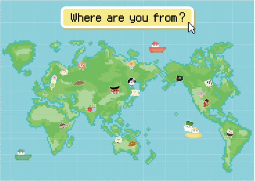 「どこからきて、どこへいくのか」をテーマに、様々な場所から来られた方々が、自身の行き来する場所を壁の地図にシールで示す参加型の展示です。