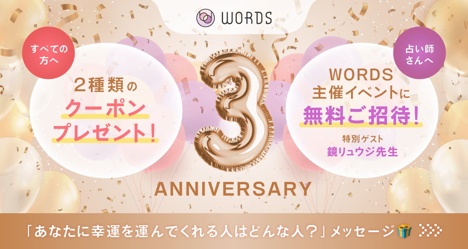 自分に合った占い師が探せる占い専門オンラインマーケット『WORDS』3周年記念キャンペーン「WORDS 3rd ANNIVERSARY」開催!占い師向けセミナー開催やお得なクーポンなど盛りだくさん!