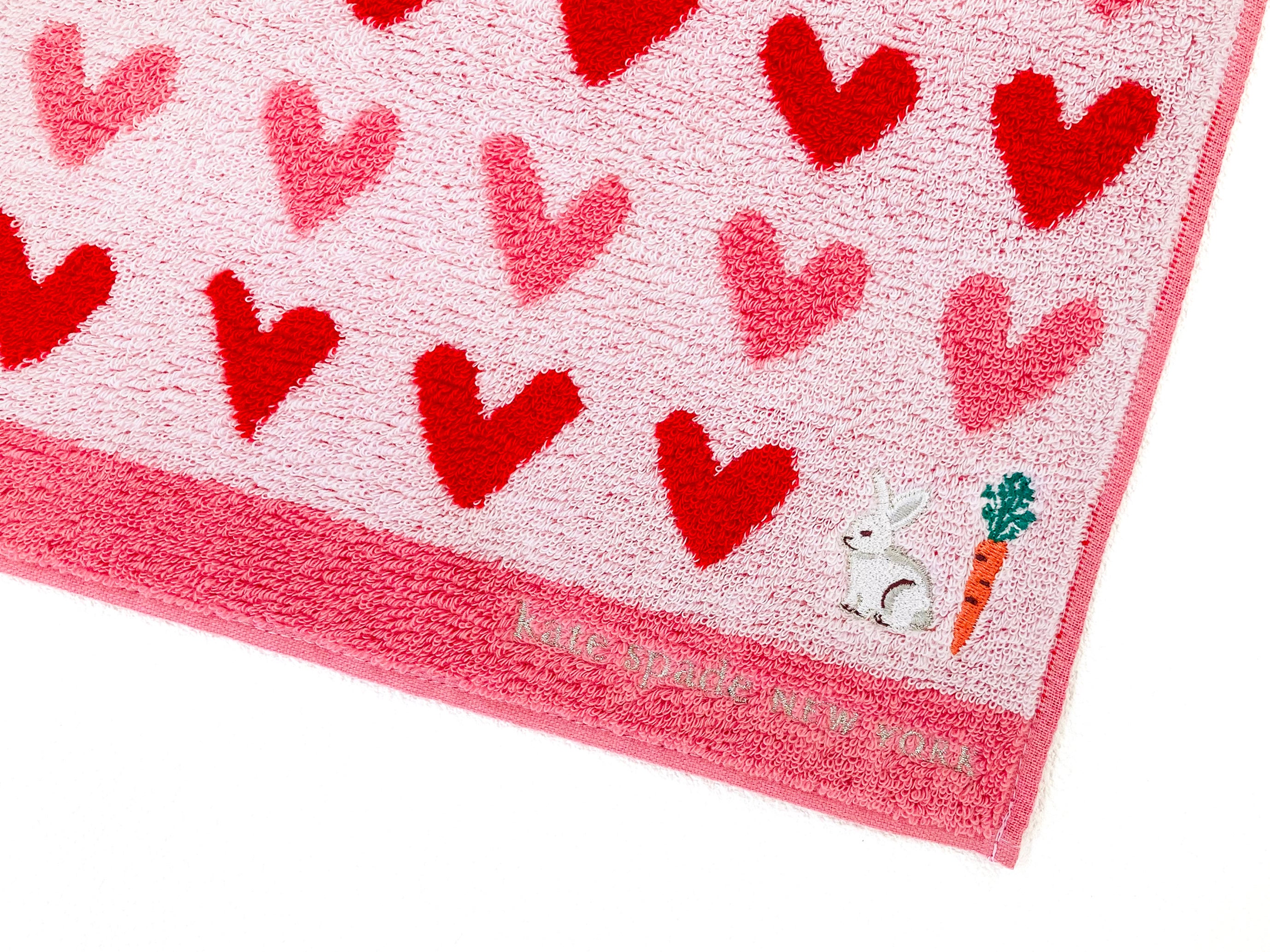 2色使いのハートモチーフの中に、うさぎアップリケとニンジンの刺繍がアクセントとなった可愛いデザイン。