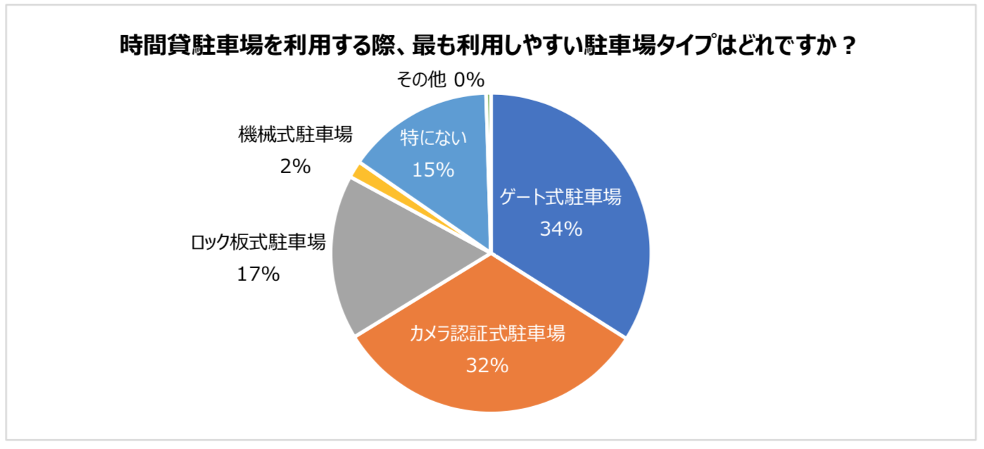 時間貸駐車場を利用する際に最も利用しやすい駐車場のタイプは、1位「ゲート式駐車場」34%、2位「カメラ認証式駐車場」32%となり、この2つで6割を超えています。