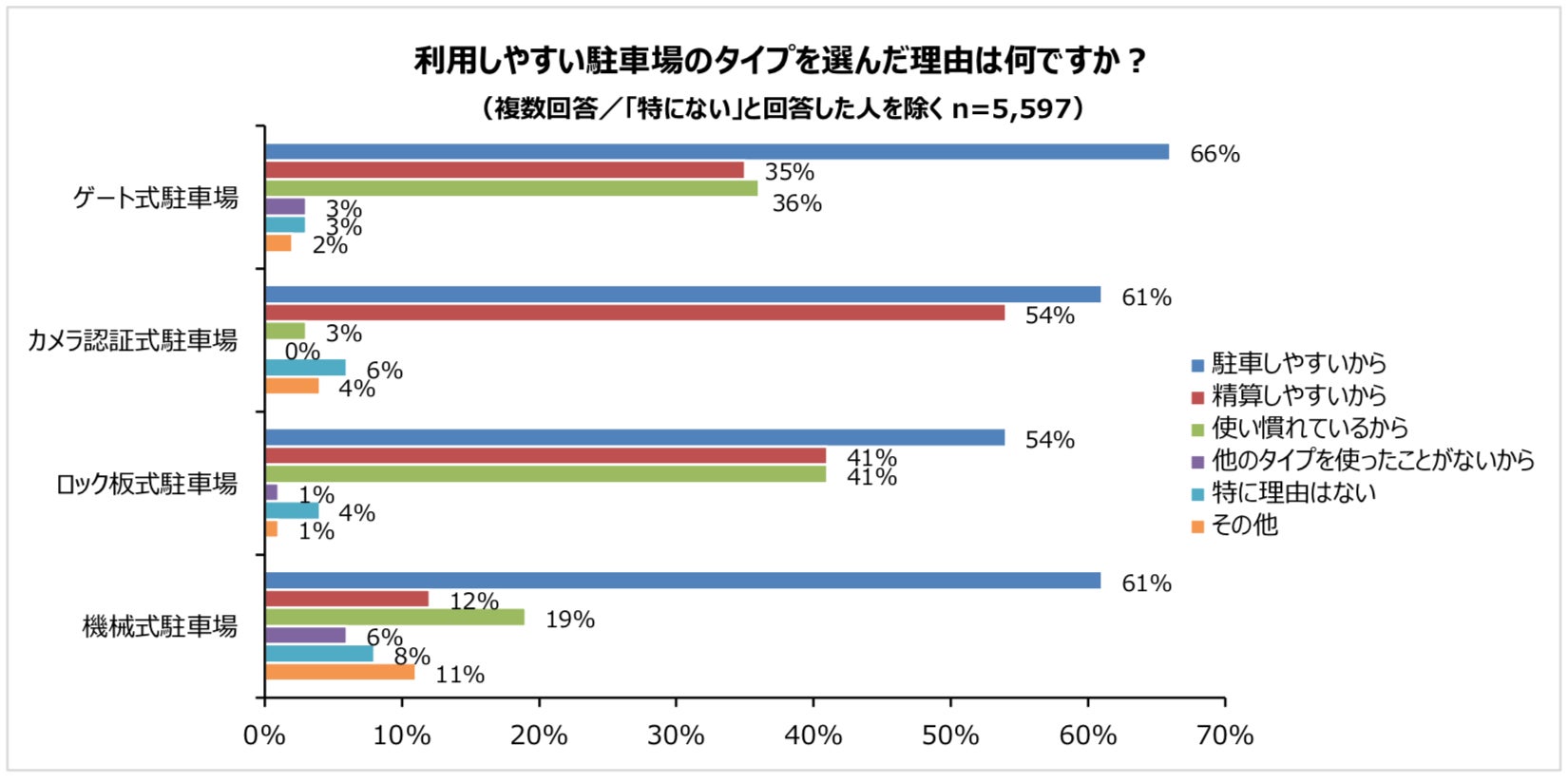 利用しやすい駐車場のタイプを選んだ理由は、全ての駐車場タイプで「駐車しやすいから」が最多となりましたが、2位以降は回答傾向に違いが見られました。