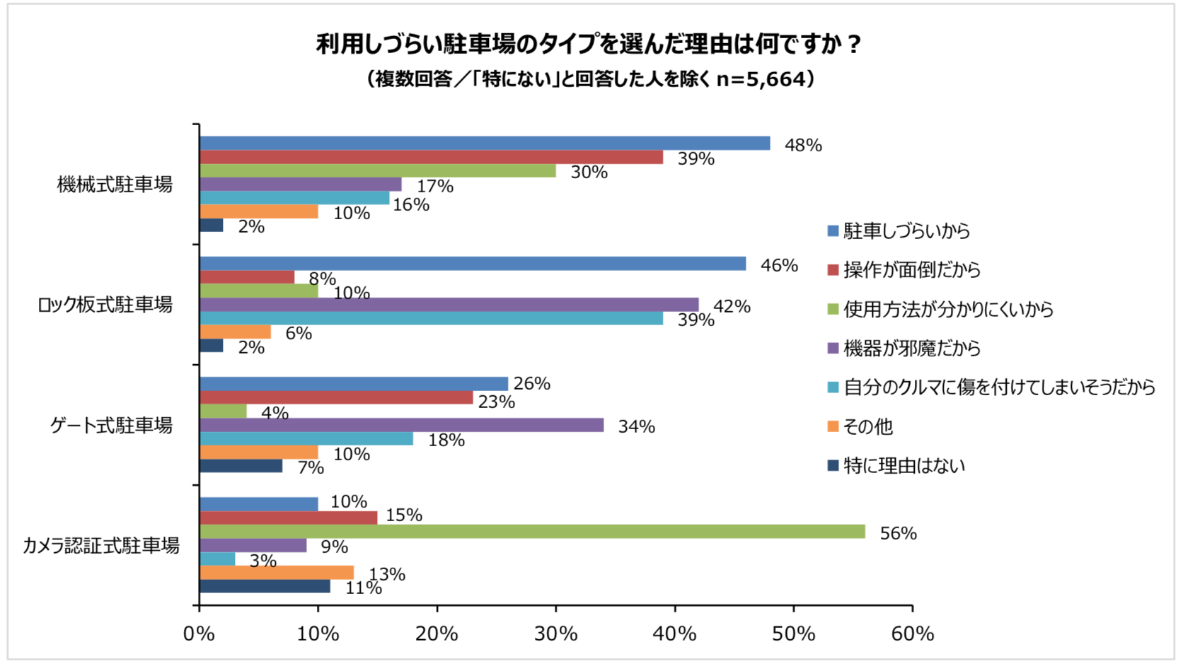 「ロック板式駐車場」は「駐車しづらいから」、「ゲート式駐車場」は「機器が邪魔だから」、「カメラ認証式駐車場」は「使用方法が分かりにくいから」が最多となりました。