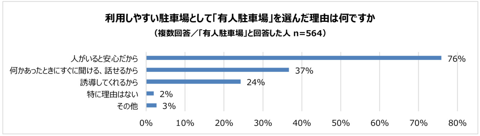 一方、利用しやすい駐車場として「有人駐車場」を選んだ理由は「人がいると安心だから」がダントツで76%でした。次いで「何かあったときにすぐに聞ける、話せるから」37%、「誘導してくれるから」24%となりました。
