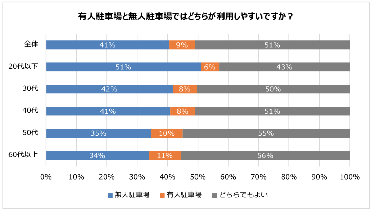 有人と無人、どちらの時間貸駐車場が利用しやすいか聞いたところ、51%が「どちらでもよい」と回答しました。次いで、「無人駐車場」41%、「有人駐車場」9%という結果になっています。年代別でみると、全年代で「無人駐車場」が「有人駐車場」を20ポイント以上上回っています。20代以下は唯一「無人駐車場」が半数を超え、「どちらでもよい」を上回りました。「有人駐車場」は、年代が上がるほど高くなっています。