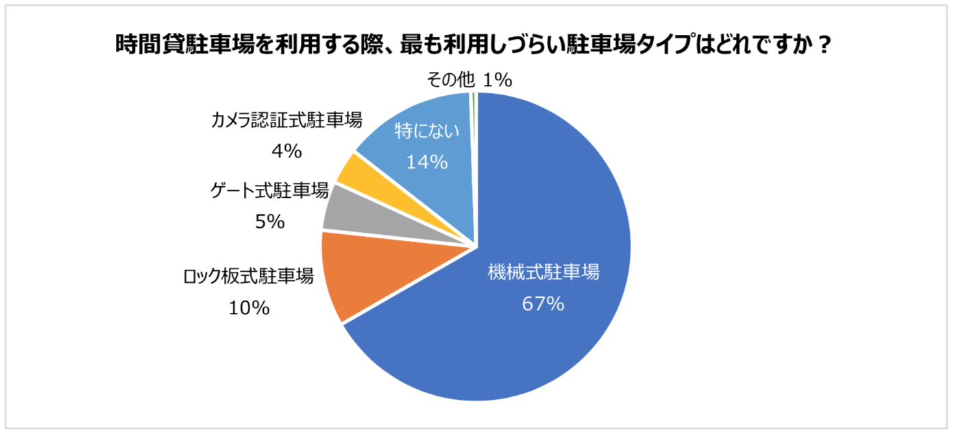 最も利用しづらい駐車場のタイプについて、3人に2人が「機械式駐車場」と回答しました。以降、「ロック板式駐車場」10%、「ゲート式駐車場」5%となっています。