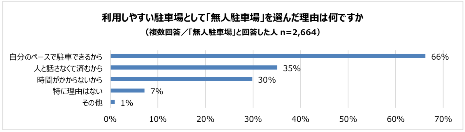 今回のアンケートでは、利用しやすい駐車場タイプを選ぶ際は駐車のしやすさを重視する方が多いことが分かりました。また、自分のペースで駐車できるため、有人駐車場よりも無人駐車場の方が利用しやすいと考えている方も多いようです。2021年に実施した「運転テクニック」に関するアンケート※1では、苦手な運転技能で「駐車」が1位になったように、駐車に対して苦手意識を持つ方が多いことが要因かもしれません。