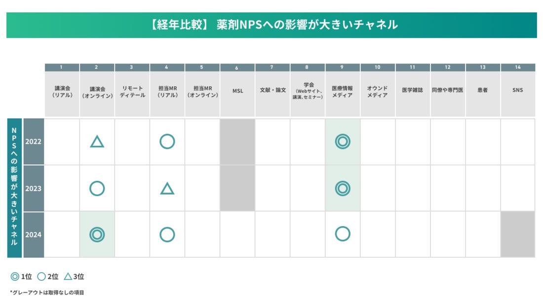 その中で、2022年(第3回)、2023年(第4回)、2024年(第5回)では、薬剤NPSへの影響が大きいチャネルTOP3は「医療情報メディア」「担当MR」「講演会(オンライン)」が占めるという結果になりました。
