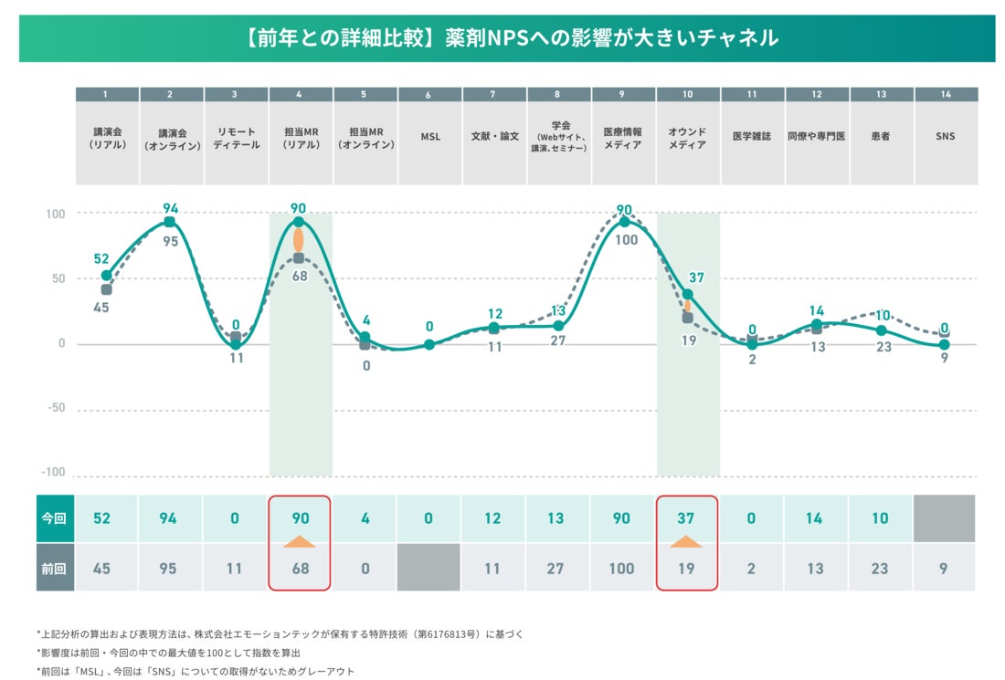本調査では、医師に対して製薬企業ごとにNPS(ネット・プロモーター・スコア)を計測し、疾患領域別に企業NPSの集計を行いました。さらに、昨年よりも処方活動への影響度が増しているチャネルについて、フリーコメントから医師がそのチャネルに対してどのような捉え方をしているのかについても分析を行っています。