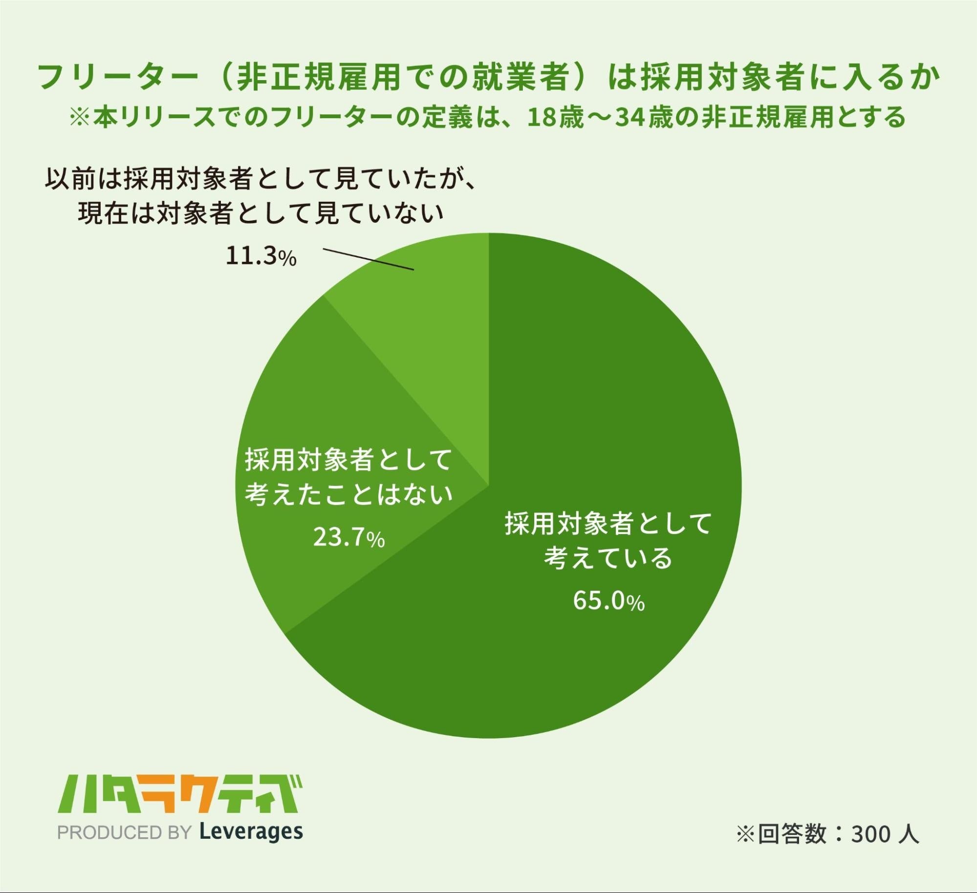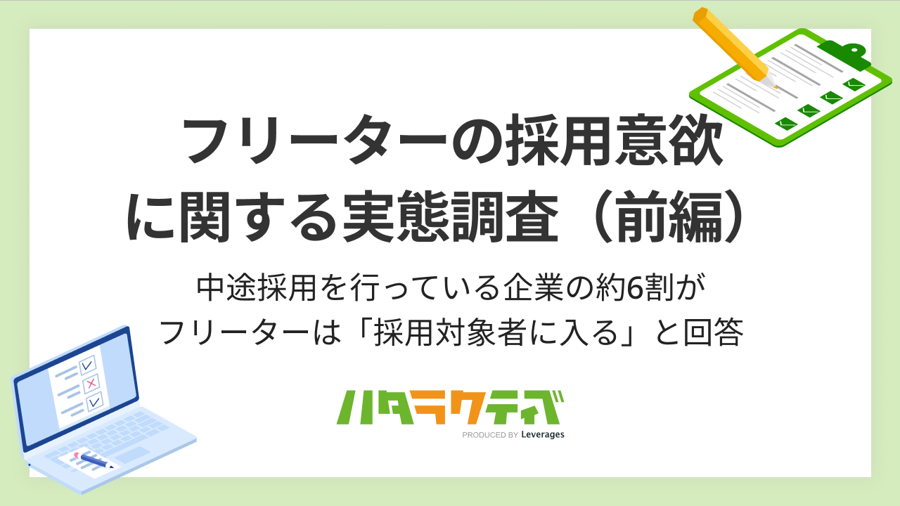 レバレジーズ株式会社が運営するフリーター・既卒・第二新卒向け就職支援サービス ハタラクティブ( https://hataractive.jp/ )は、中途採用を行っている企業の採用担当者300人を対象に、フリーター※の採用意欲に関する実態調査を実施しました。本調査は前編・後編に分かれた発表となり、今回は前編をお届けします。後編は、1月上旬に配信予定です。※本調査では、フリーターの定義は18歳〜34歳の非正規雇用とします
