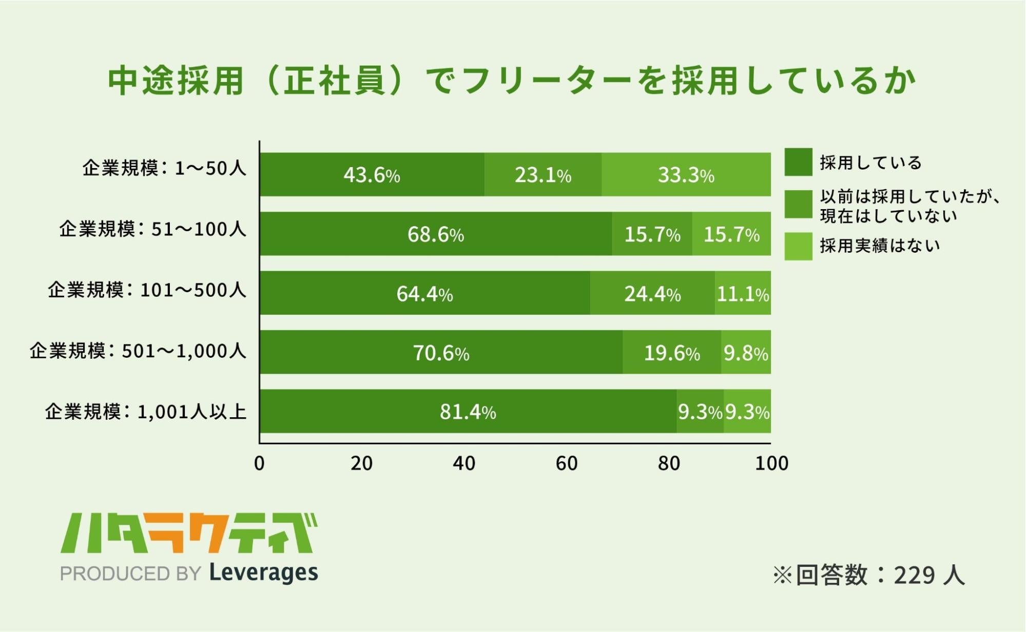 企業規模別では、会社の規模が大きくなるほどフリーターの雇用実績が高くなり、会社規模が大きいほど過去の経歴よりもポテンシャルに重点を置いた採用を行っていることが明らかになりました。