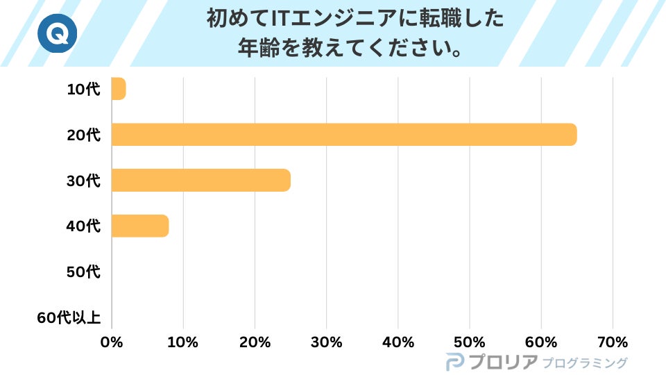 20代が65%を占める一方、30〜40代も一定数存在。若年層を中心に、幅広い年齢層でITエンジニア転身が行われていることがうかがえます。