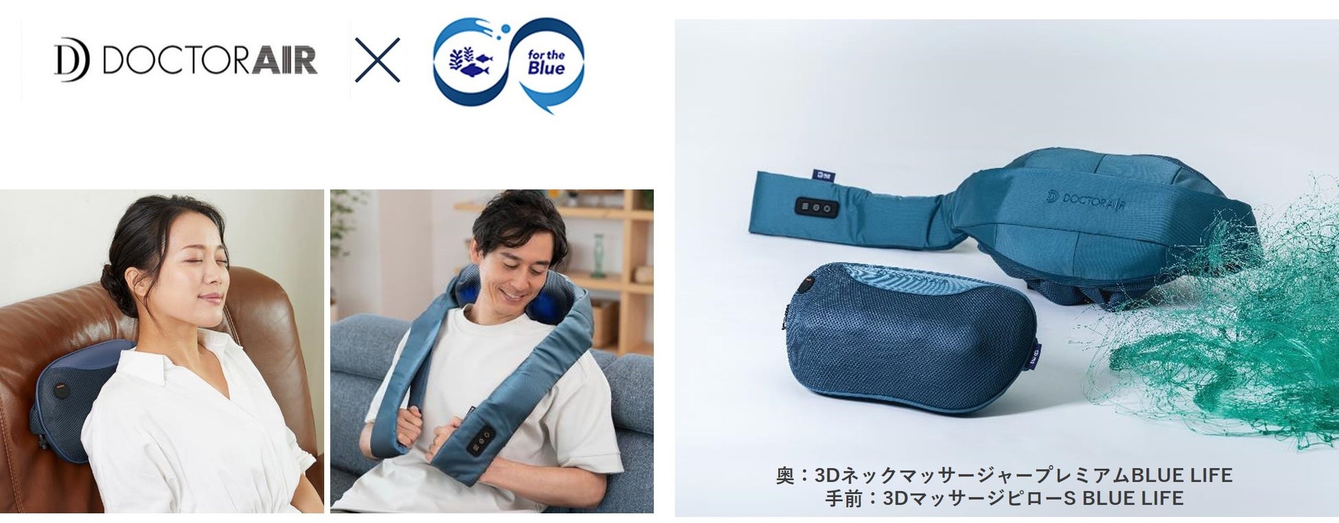 【BULE LIFE】の一歩目として発売する「3Dネックマッサージャープレミアム」・「3DマッサージピローS」は、充電タイプでいつでも場所を選ばす手軽に首や肩・腰などを心地よく揉みほぐしてくれる人気のマッサージツール。ドクターエアだからこその“人の健康”と“海の健康”を想う製品が誕生しました。