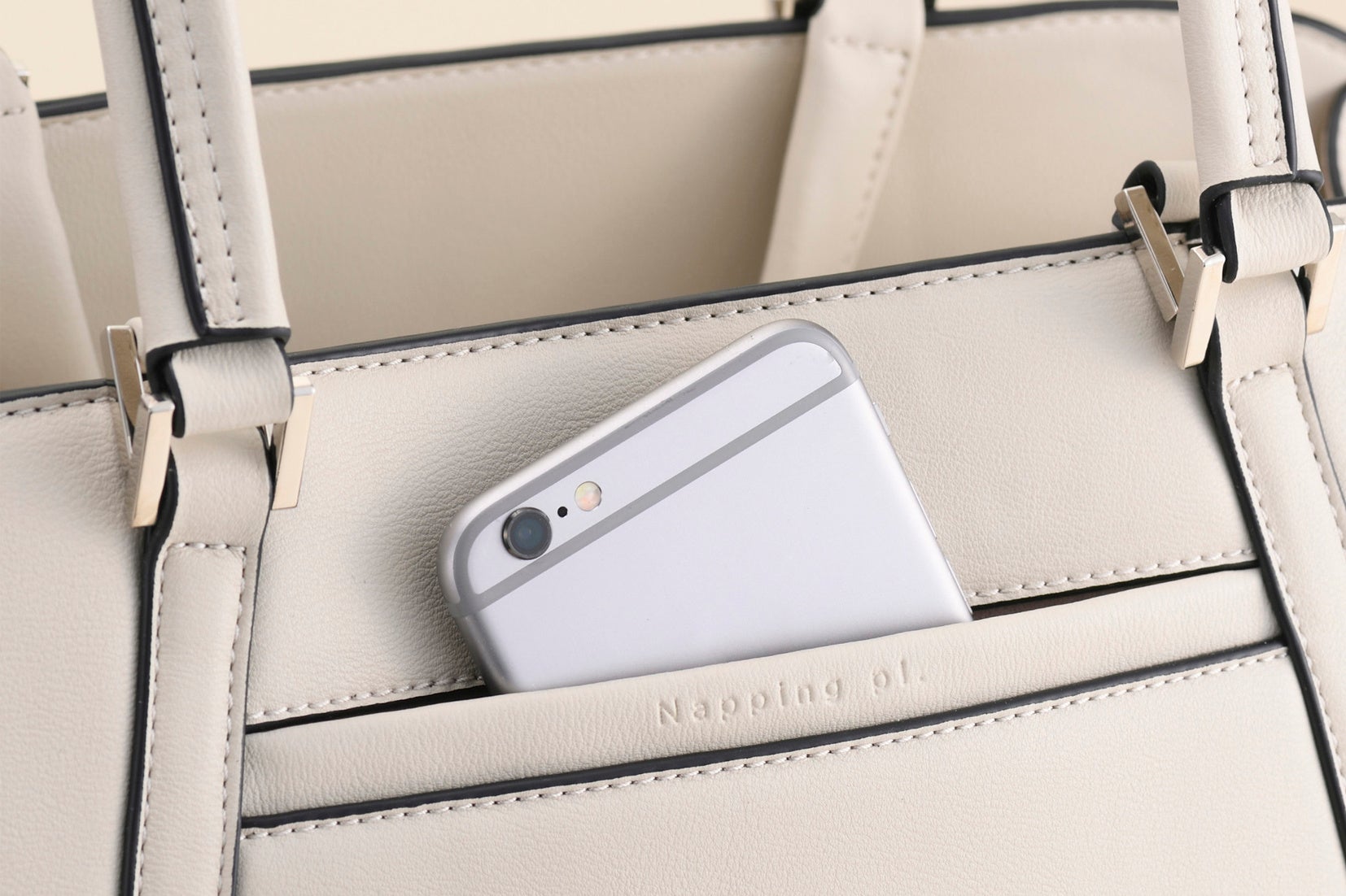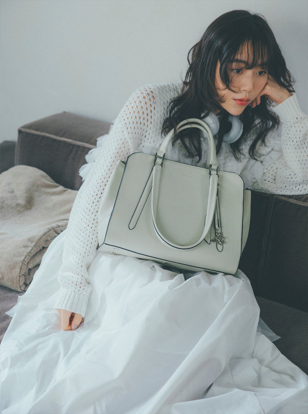ハンドルも、肩にかかる「ロングハンドル」と、手持ちできる「ショートハンドル」がダブルで付いているので、バッグの中身を入れ替える手間なく、服装に合わせて印象を変えることができます。