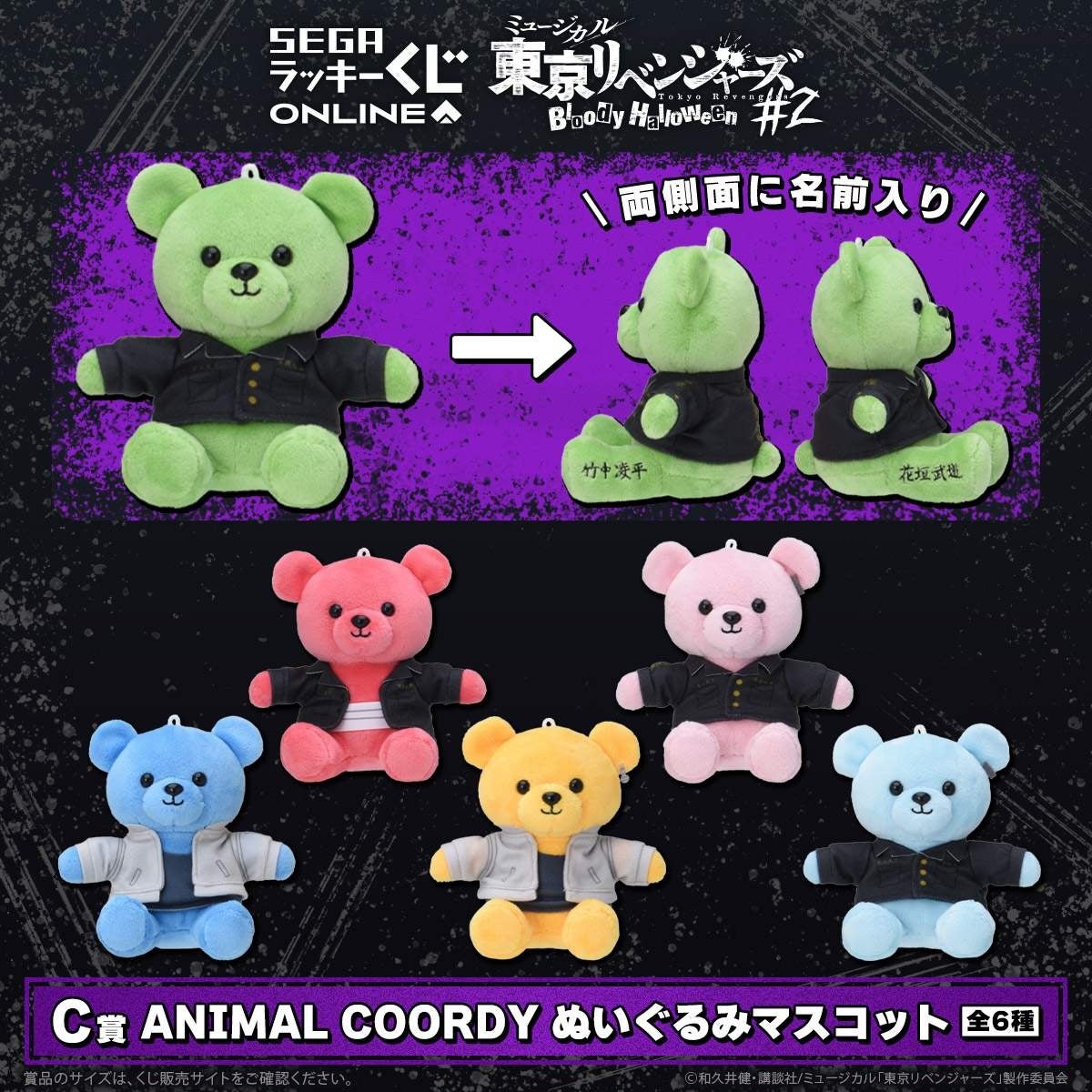 C賞「ANIMAL COORDY ぬいぐるみマスコット」では、キャストをイメージしたくまにキャラクター名&キャスト名を刺繍した、こだわりの仕上がりとなっております。