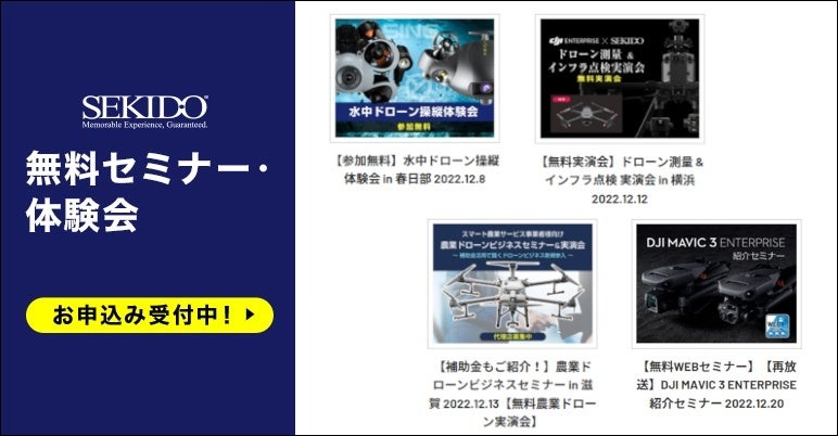セキドでは、より多くの事業者の方にドローンを使った業務効率の改善を実現していただくため、業務用ドローンや関連ソリューションをご紹介する無料セミナーやイベントを定期的に開催しております。今後もオンラインや全国各地での開催を予定しておりますので、ご興味をお持ちのイベントにはぜひお気軽にご参加ください。