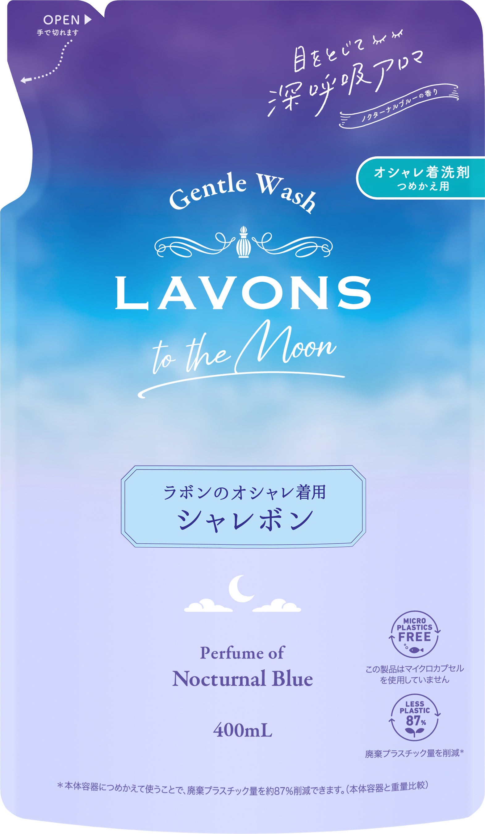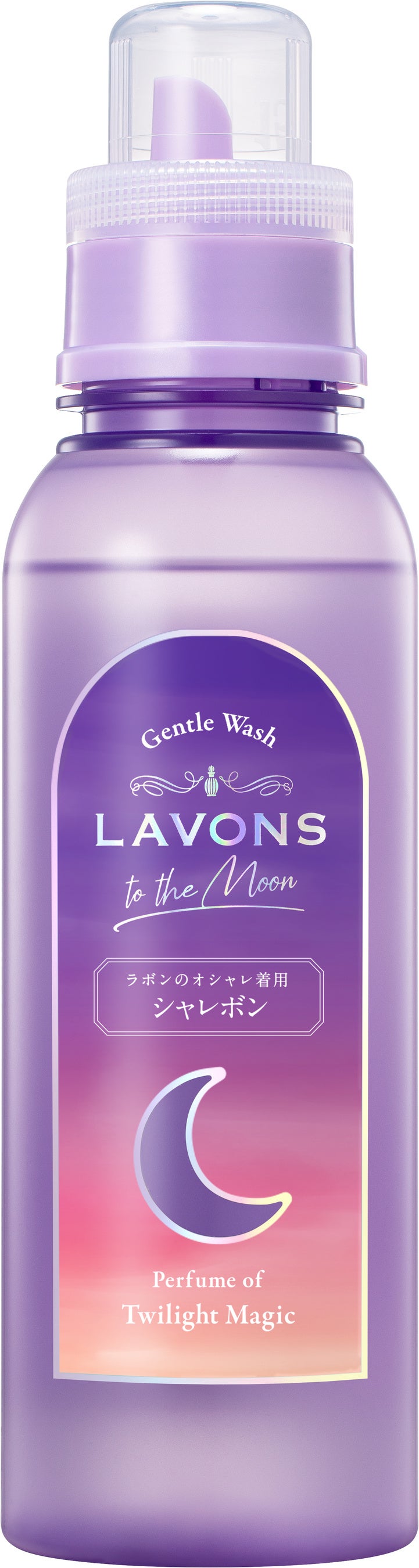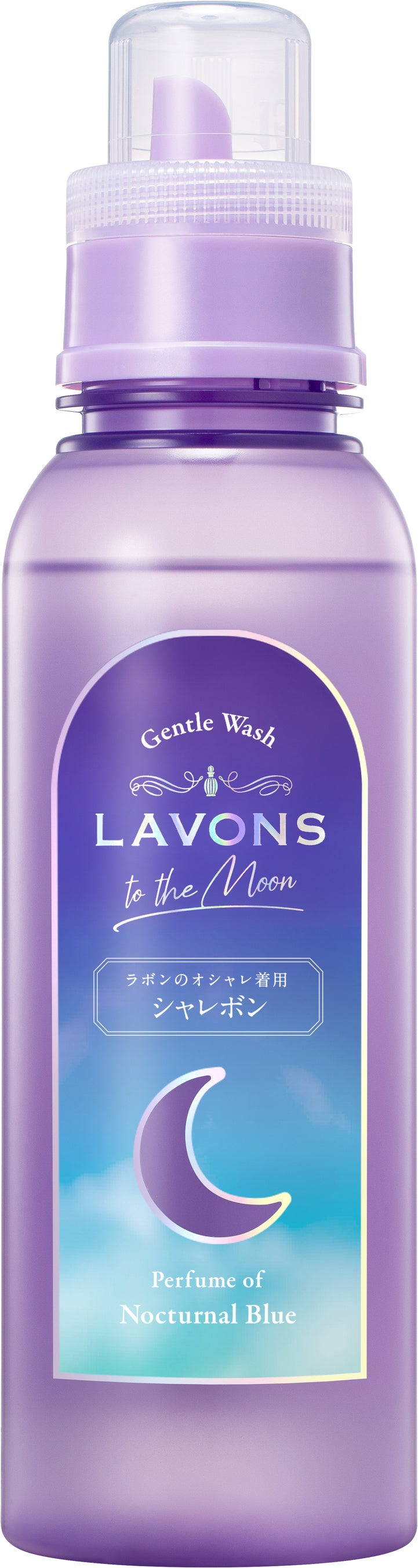 パッケージは、グラデーションで描かれた幻想的な空が背景となり、中央に月の形をしたくり抜きがある透明なボトルデザインです。ランドリールームをおしゃれに彩ってくれます。