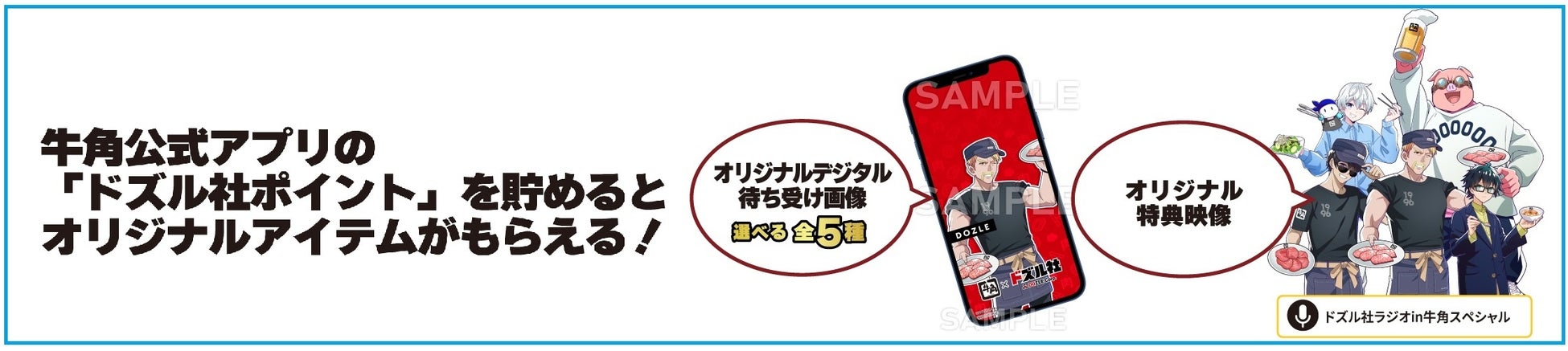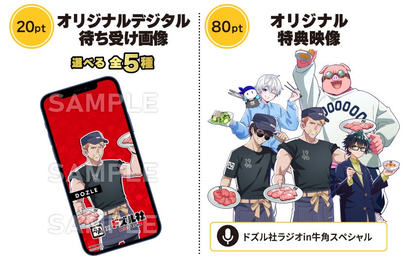 キャンペーン期間中に牛角に来店し、会計時に「牛角公式アプリ」をレジで提示すると、会計金額に応じて「ドズル社ポイント」が貯まります。貯まったポイントはオリジナルアイテムと交換ができます
